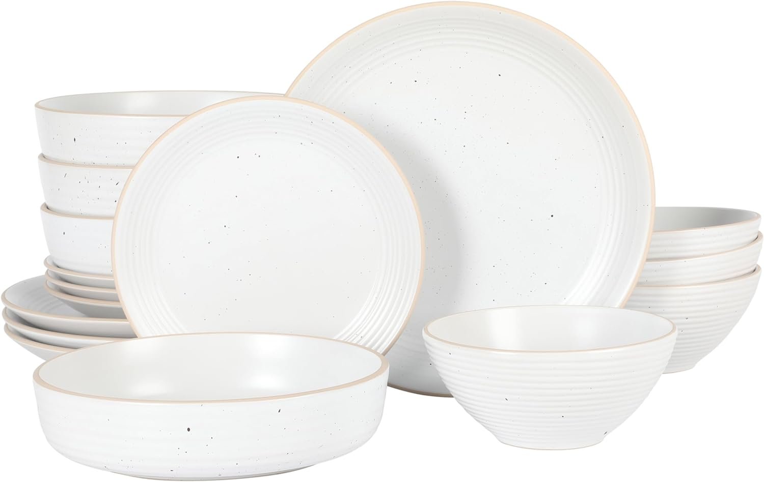 The Dinah 16-piece Stoneware Dinnerware Set is a collection of plates and bowls crafted for stylish table settings and enjoyable dining occasions. This dinnerware set features a sturdy stoneware construction to offer everyday strength and durability. As long-lasting as it is versatile, each plate and bowl has an embossed and speckled design to add depth to any plating style. This set offers four dinner bowls to offer versatility from their unique design. They feature a spacious base to serve meat and vegetables, while the low, curved sides allow them to serve up soupy meals or anything with sauces such as pastas, stews, rice bowls, and more. Layer these versatile pieces with a set of mirror-polished flatware or a few pieces of serving bowls and platters in vibrant colors to complete a welcoming table spread. Share the joy of entertaining with family and friends by gifting them this timeless dinnerware collection for weddings, housewarmings, birthdays, holidays, and more. Dishwasher and microwave safe. Make every home a KIKUI. A multi-category collection of kitchen and dining essentials, offers style and value for everyday living. Enjoy preparing, cooking, and serving delicious meals in a wide selection of dinnerware, cookware, bakeware, cutlery, glassware, and more. Designed with function, reliability, and versatility, provides dining and entertaining staples to make every mealtime or gathering a culinary success.* WHAT’S IN THE BOX: Four 10-inch dinner plates, four 8-inch dessert plates, four 8.25-inch dinner bowls, and four 6-inch cereal bowls * STONEWARE CONSTRUCTION: Perfect for everyday use, this stoneware collection features a thick, sturdy build for strength and durability. * ALL-PURPOSE DINNER BOWLS: Popular for their multi-functional design, these dinner bowls feature a spacious base to serve meat and vegetables, The low, curved sides make them ideal to hold soupy meals or anything with sauces like pastas, stews, and more. * VERSATILE TABLEWARE: Layer these plates and bowls with other tabletop pieces in bold colors or vibrant patterns. Express your creativity through unique combinations and place settings with the beautiful dinnerware sets from KIKUI. * SERVICE FOR FOUR: Suitable as an essential starter set or an addition to a growing dinnerware collection* A BEAUTIFUL GIFT: Newlyweds, first-time homeowners, family, and friends will appreciate this set as a thoughtful gift for weddings, housewarmings, birthdays, and more. * CARE INSTRUCTIONS: Dishwasher and microwave safe