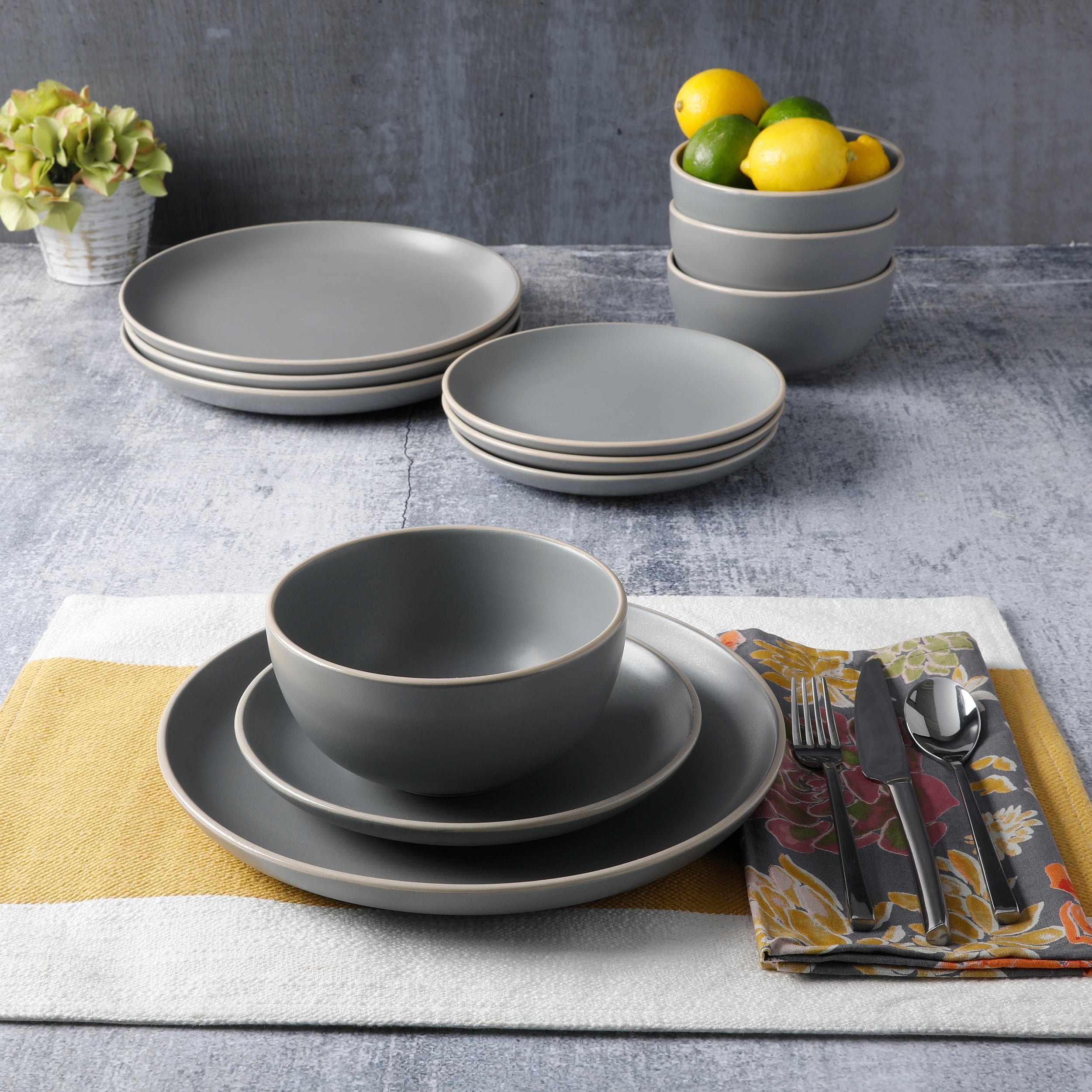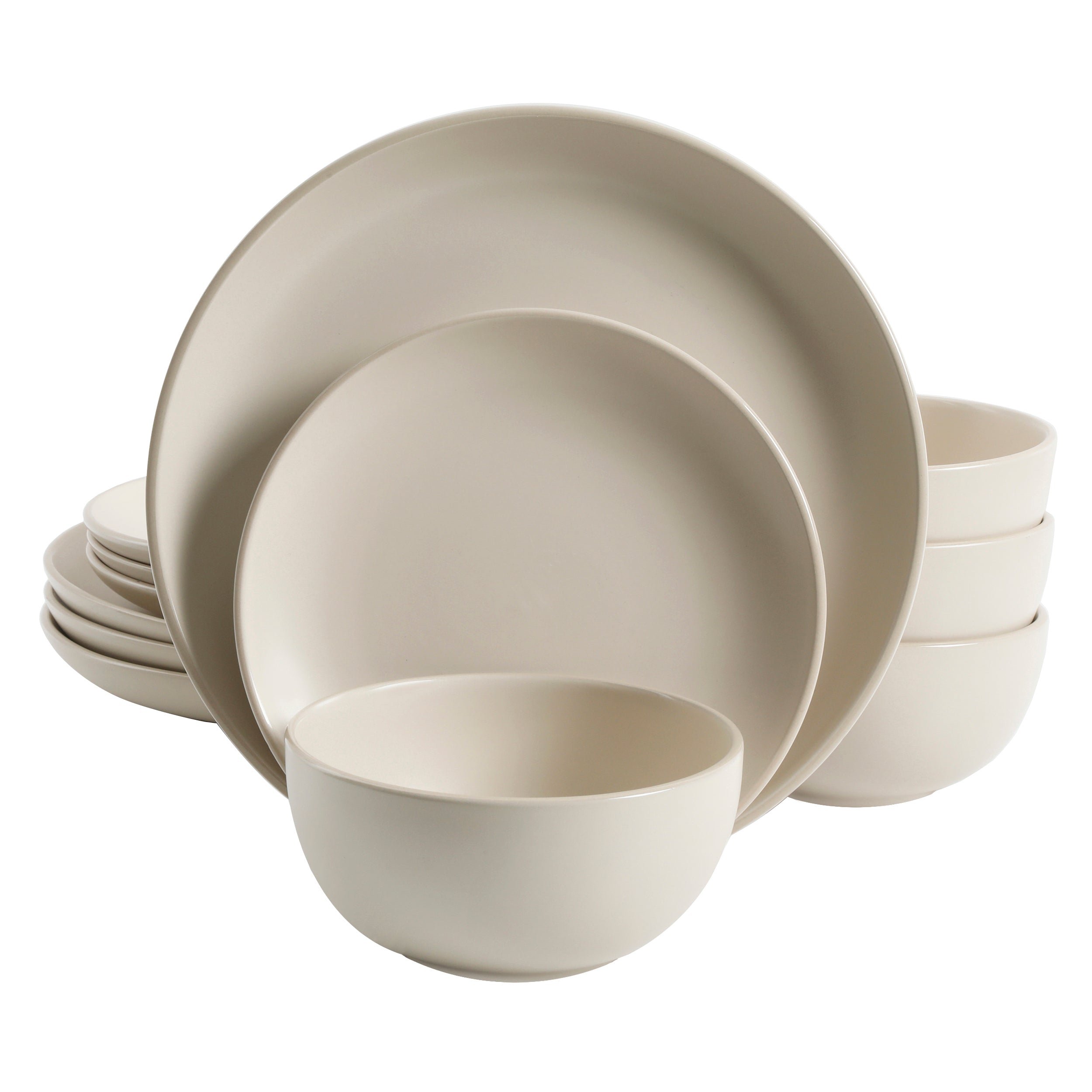 The Rockaway 12-piece Stoneware Dinnerware Set is the perfect meeting place between contemporary style and everyday functionality. Every piece of this dish set has a soft matte glaze finish on a stoneware material that brings the latest on-trend colors to your dish collection. The Rockaway classic coupe shape looks great with any table setting and provides additional surface area for showing off delicious homemade meals. No matter what the occasion is the Rockaway 12-piece plate and bowls Set is a set you need in your home. All items are made of durable stoneware that is dishwasher and microwave safe. This plate and bowls set offers service for four including 4 dinner plates, 4 dessert plates and, 4 bowls. Whether you